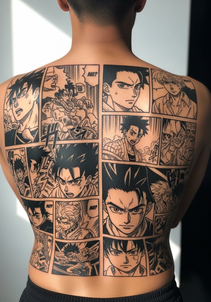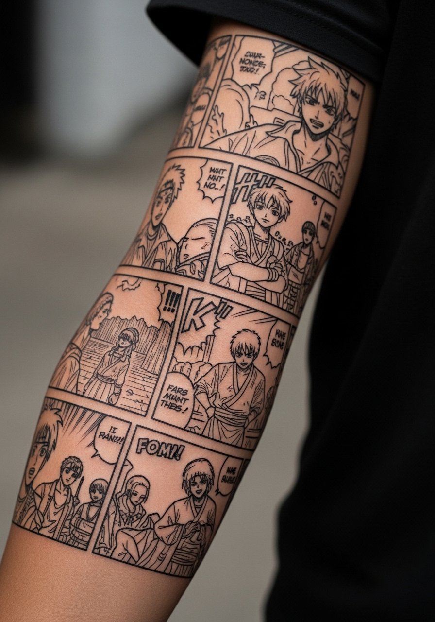 There is a strong visual impact when you turn a forearm into manga panels. I recommend this for people who like storytelling tattoos. Pain is low to moderate on the outer forearm. Plan multiple short sessions, usually two to three, depending on how many panels you want. During your consult, bring screen captures that show panel gutters and lettering style. Artists warn against cramming dozens of tiny panels. Too many small panels blur into a patch. This larger-panel approach avoids that. After six months, panels may soften slightly. Saniderm helps during the initial week to keep edges clean. Consider working with an artist experienced in graphic compositions.