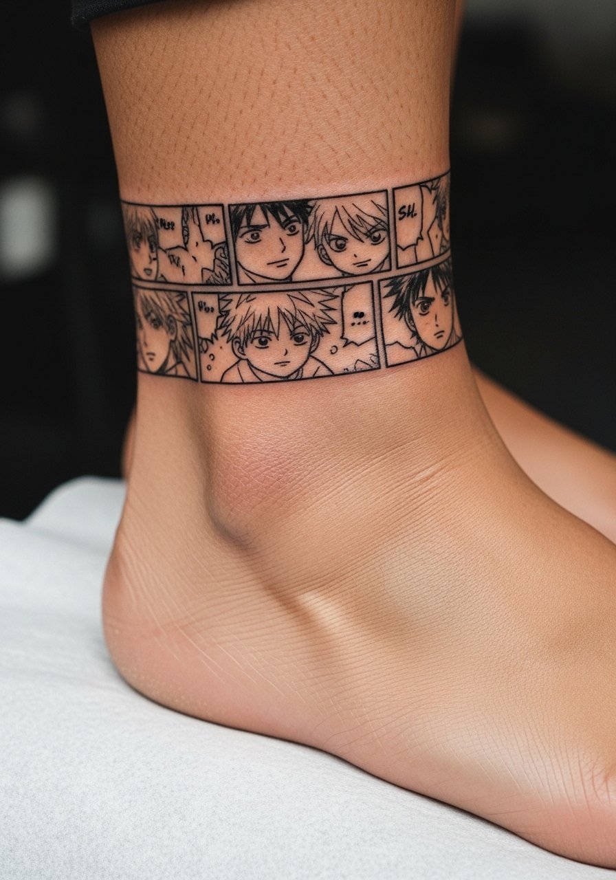 I recommended this to someone who wanted a subtle manga story. The ankle is painful and constricted, but it gives a wrap effect that looks great. Expect a moderate to high pain level when the needle hits bone. Keep sessions short. Tell your artist you want slightly bolder outer lines around each micro-panel. The common error is using ultra-fine internal lines. Those can wash together as the ankle skin moves. At six months, expect slight graying of tight crosshatching. If you want the same design on the calf, lines can be finer and will hold better.