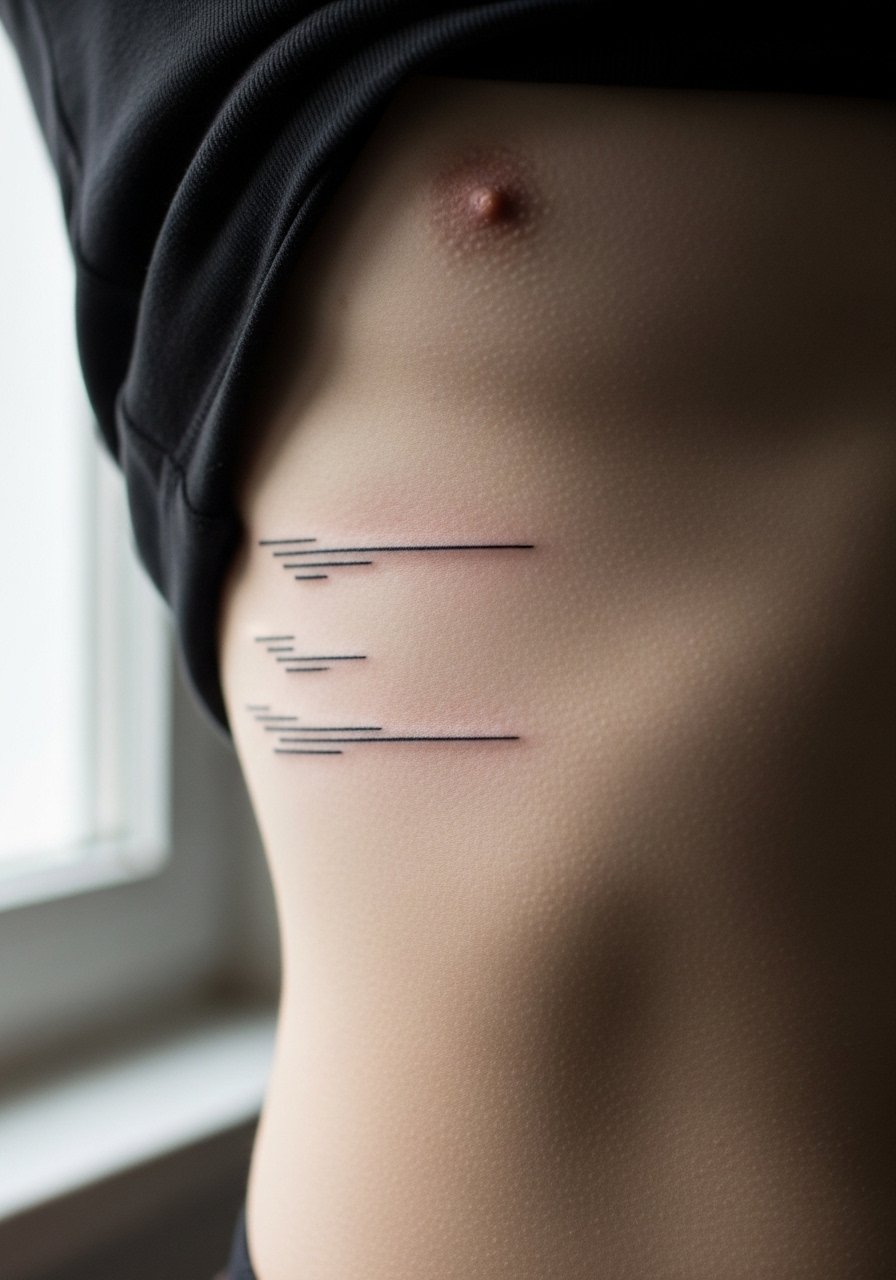 Fair warning, ribcage tattoos hurt. I have one and I will say the motion-line aesthetic is worth the discomfort for some. Pain is high and sessions vary with size. If you want clean motion lines, ask for thicker outer strokes and leave the thinnest inner strokes out. Everybody makes the mistake of demanding extremely tight speed lines that end up looking fuzzy after healing. The ribcage's movement makes those lines migrate. After nine months, they often soften. If you want the same effect with less pain, try the side torso where the skin tends to settle with less distortion.