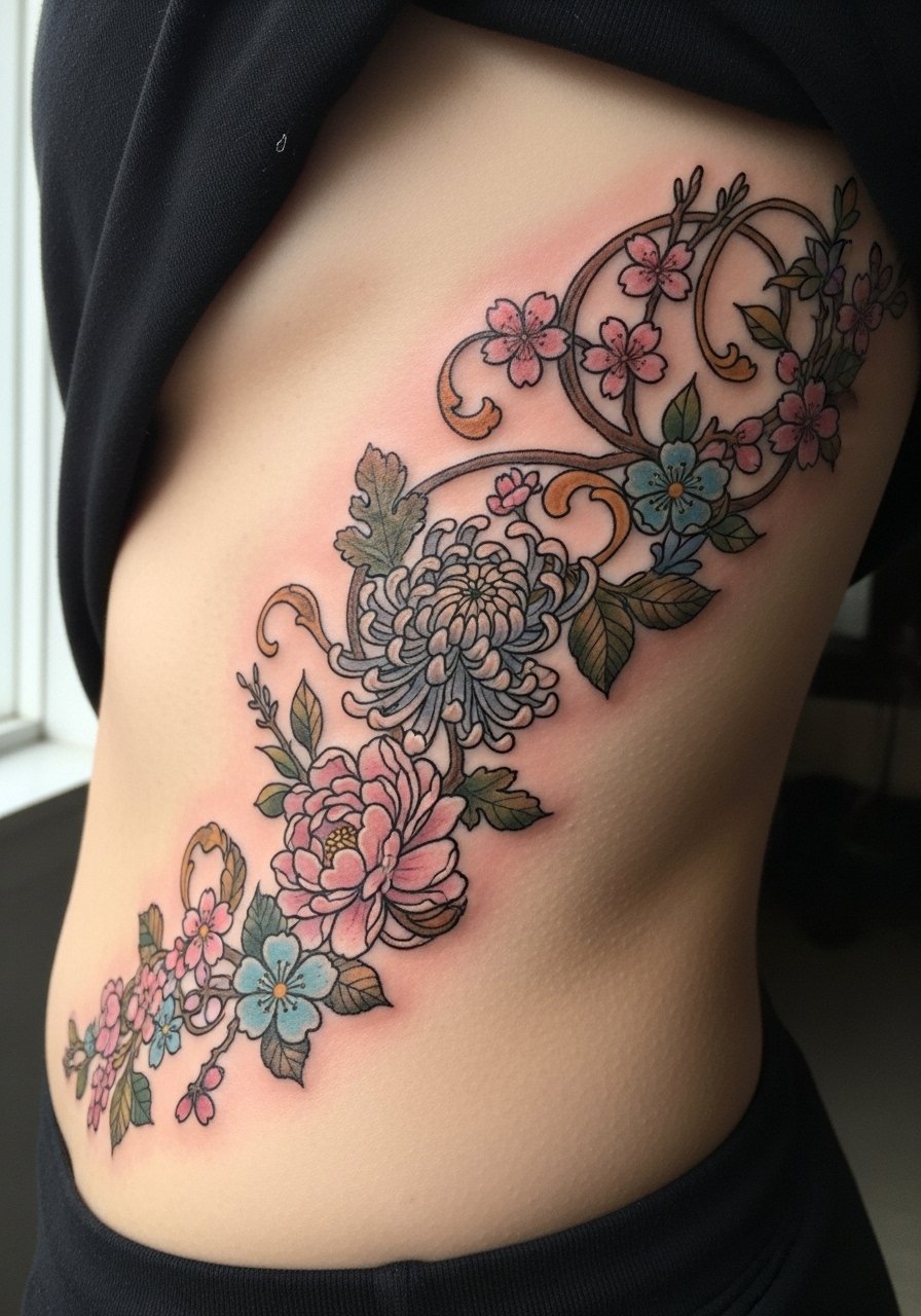 I admired the rhythm of floral borders paired with manga faces at a studio. The rib is painful but it gives a flowing frame. Pain ranges high. Sessions can be one to two hours for a single border. Tell your artist to use medium-weight lines for petals and avoid hairline veins. Many people ask for intricate vein work that blurs. On the rib, detailed veins soften into a wash. If you prefer a less painful spot, the lateral thigh keeps the flow and improves longevity.