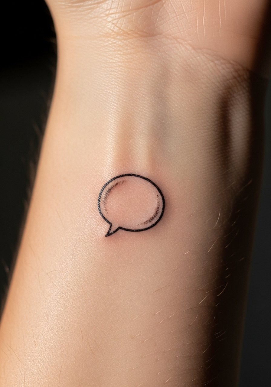 I recommend caution with tiny wrist text or bubbles. The wrist is exposed to sun and motion, which cause lines to soften. Pain is low to moderate. Sessions take under 30 minutes. Ask for bold bubble outlines and simplified text. People often request tiny fonts that blur into an unreadable line. Over the first year the bubble may require touch-up. If you prefer a permanent readable statement, put the speech bubble on the inner forearm.