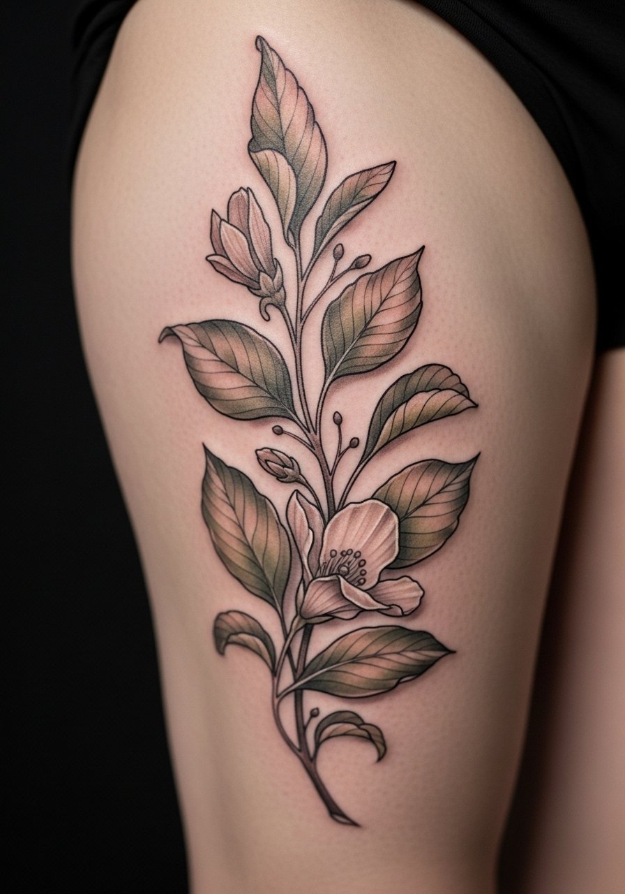 Botanical realism on the thigh lets an artist show texture—the veins on leaves, dew drops, and subtle color shifts. Thigh skin tolerates longer sessions and heals with minimal movement, so realism holds up nicely. I’ve seen these pieces keep their depth for years if the artist uses strong contrast and good saturation. Pain is generally manageable because the area has more flesh. Avoid overly fine dots in shaded areas; they can disappear. Ask to see healed realism portfolios—Oskar-style realism examples are worth referencing when you consult.