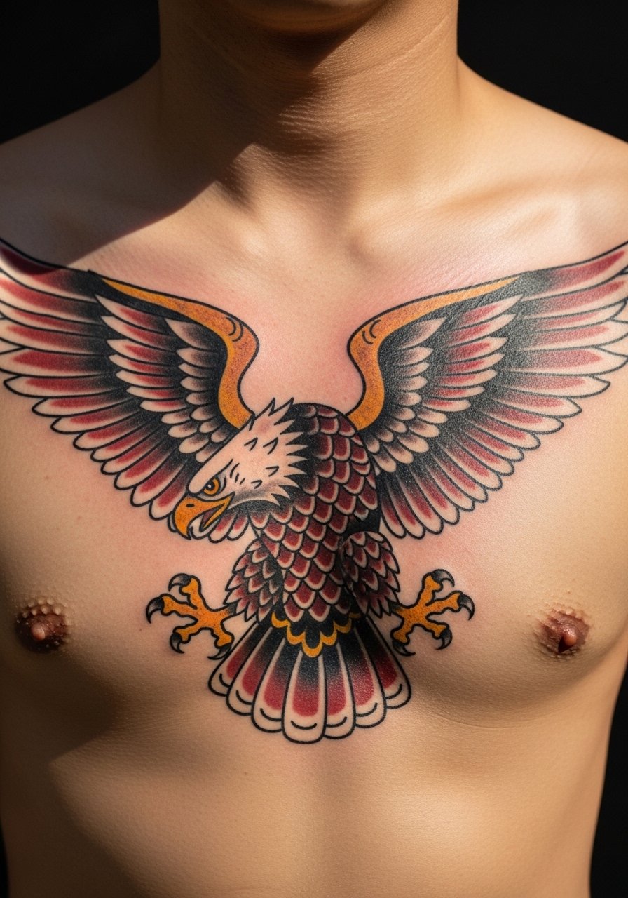 Traditional chest pieces lean on thick outlines and simple palettes so they stand the test of time. The sternum and chest can be more painful, especially near bone. I’ve found these tattoos keep strong contrast even after years. Placement suits symmetrical designs that anchor your torso. The common error is tiny details on a broad area—traditional is about readable iconography. If you want a timeless piece, ask for classic line weight and healed photos. This style pairs well with nature motifs that symbolize strength.