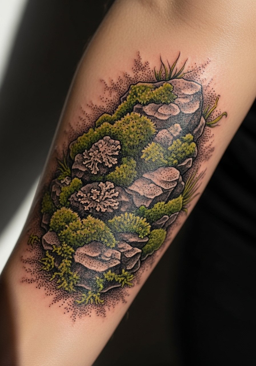 Textures like moss and lichen make tattoos feel lived-in. Forearms are great for showing layered textures without too much distortion. From what I've seen, artists who use micro-dotwork balance texture with clear silhouette so the piece ages naturally. This type of nature tattoo design is perfect if you want something grounded and organic.