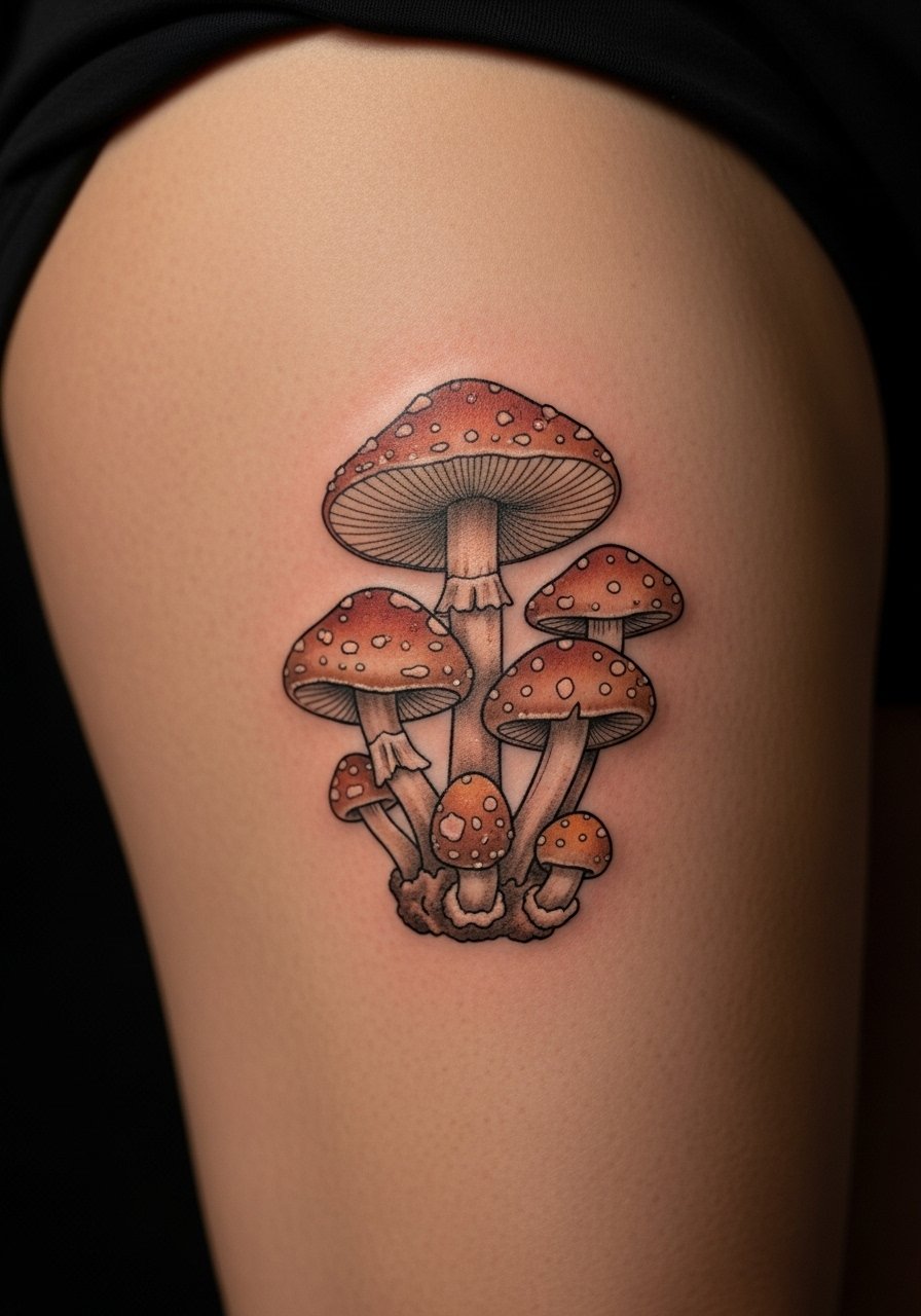 Mushroom clusters feel cozy and grounded. Thighs are a relaxed canvas and accommodate organic groupings. I’ve noticed mushrooms age nicely when shading is balanced and outlines are present. They’re good if you want a nature tattoo that reads like a small scene rather than an icon.