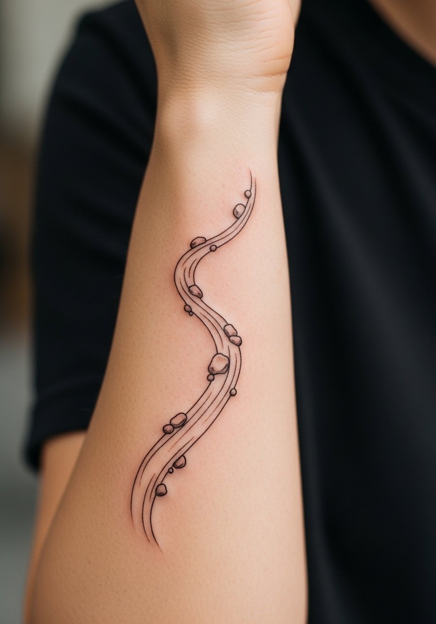 A single river line can feel calming and continual. I like wrapping lines because they interact with your arm movements. Forearm placement makes it easy to show or conceal. Keep line width consistent to avoid patchy healing. Many artists treat this as a design that ages into soft continuity—avoid tiny annotations that might blur.