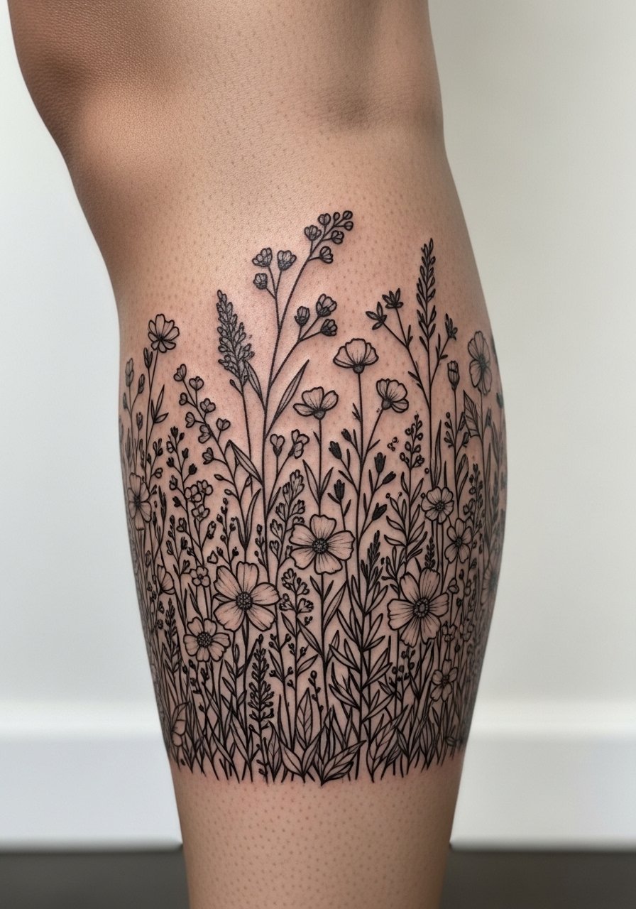 A calf band of wildflowers reads like a strip of meadow. I often recommend moderate line weight for this area to keep individual stems readable. The design works well for casual show-off and stays coherent as skin shifts when you move. It’s a comfortable placement with a relaxed healing curve.