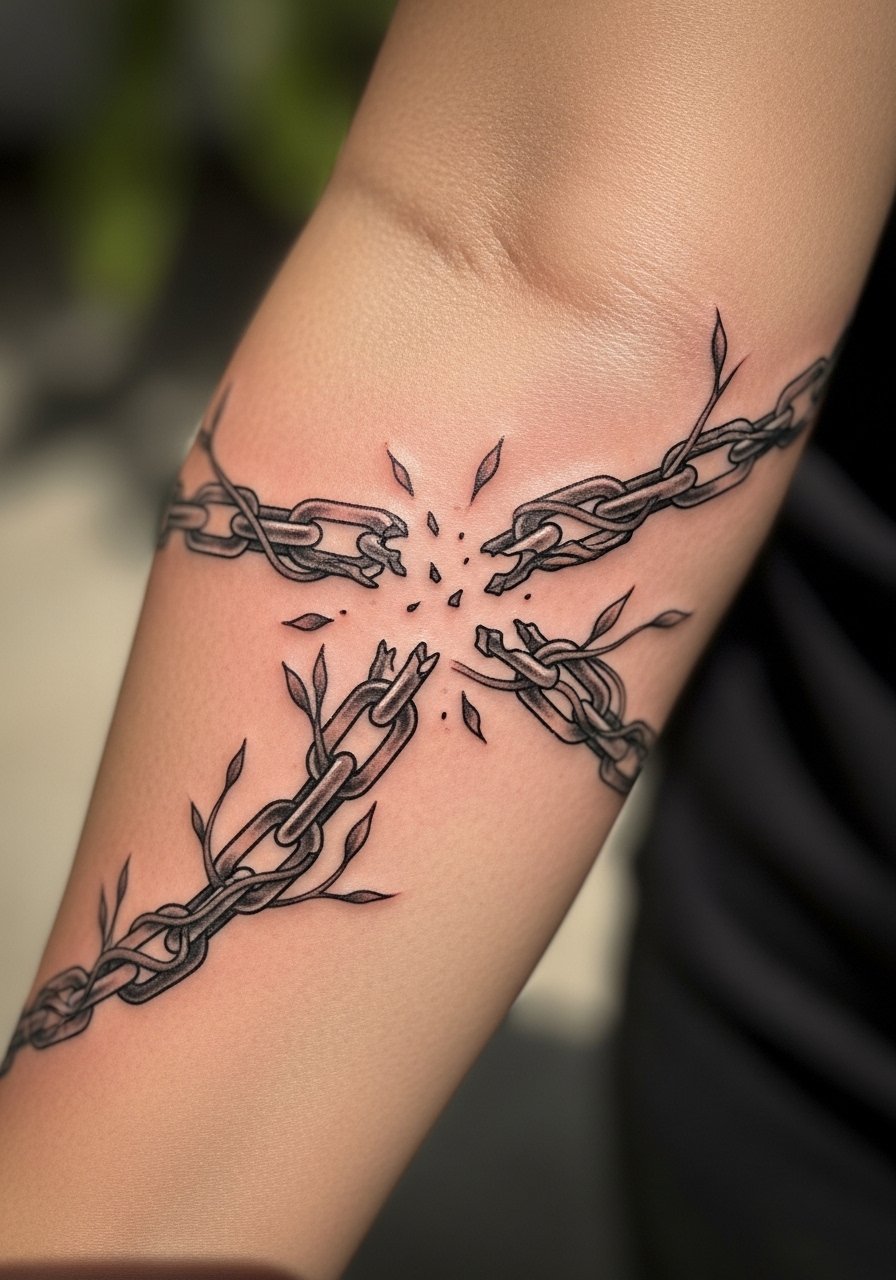 I included this under-covered idea because it pairs transformation symbolism with nature. The inner forearm is great for readable narratives. I’ve seen this design resonate with people who want growth imagery without a literal phoenix. Avoid tiny chain links that clutter—bolder shapes with organic vines read better long-term.