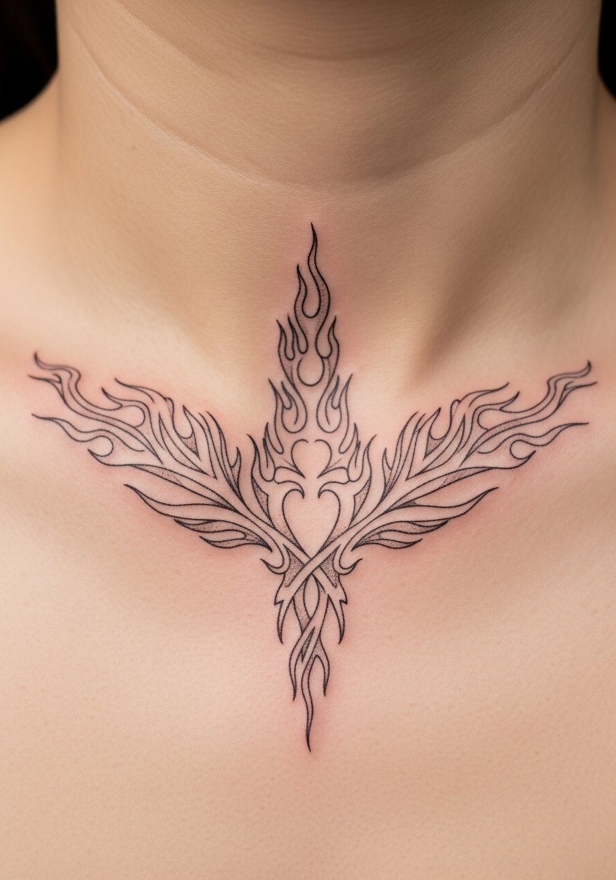 This is one of the under-covered Y2K fusion angles I’ve seen resurface. Tribal flames done in fine line read nostalgic without shouting. Collar placement shows off the waves subtly. Keep scale modest—very thin lines near the collar can fade. Mention Y2K references to your artist so they capture that era’s proportions without overdoing kitsch.