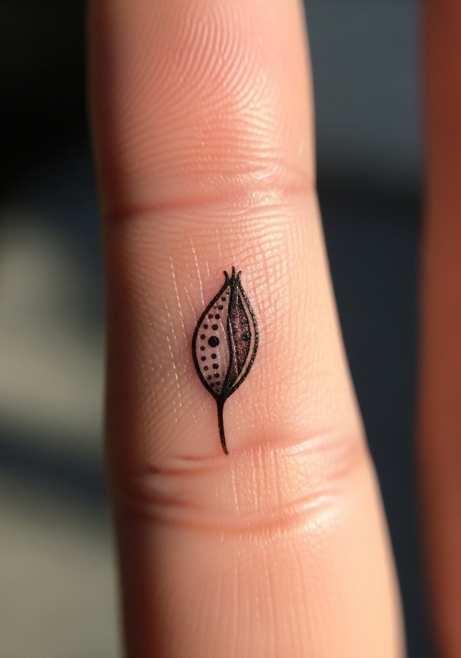 Small seed pods are quiet affirmations of potential. I like how they sit on finger bones and follow the motion of your hands. Fingers need straightforward designs—tiny dotwork can vanish, so ask for confident outlines. Expect quick pain and common touch-ups over the years. If this is your first nature tattoo, it's a gentle way to test placement while keeping meaning.