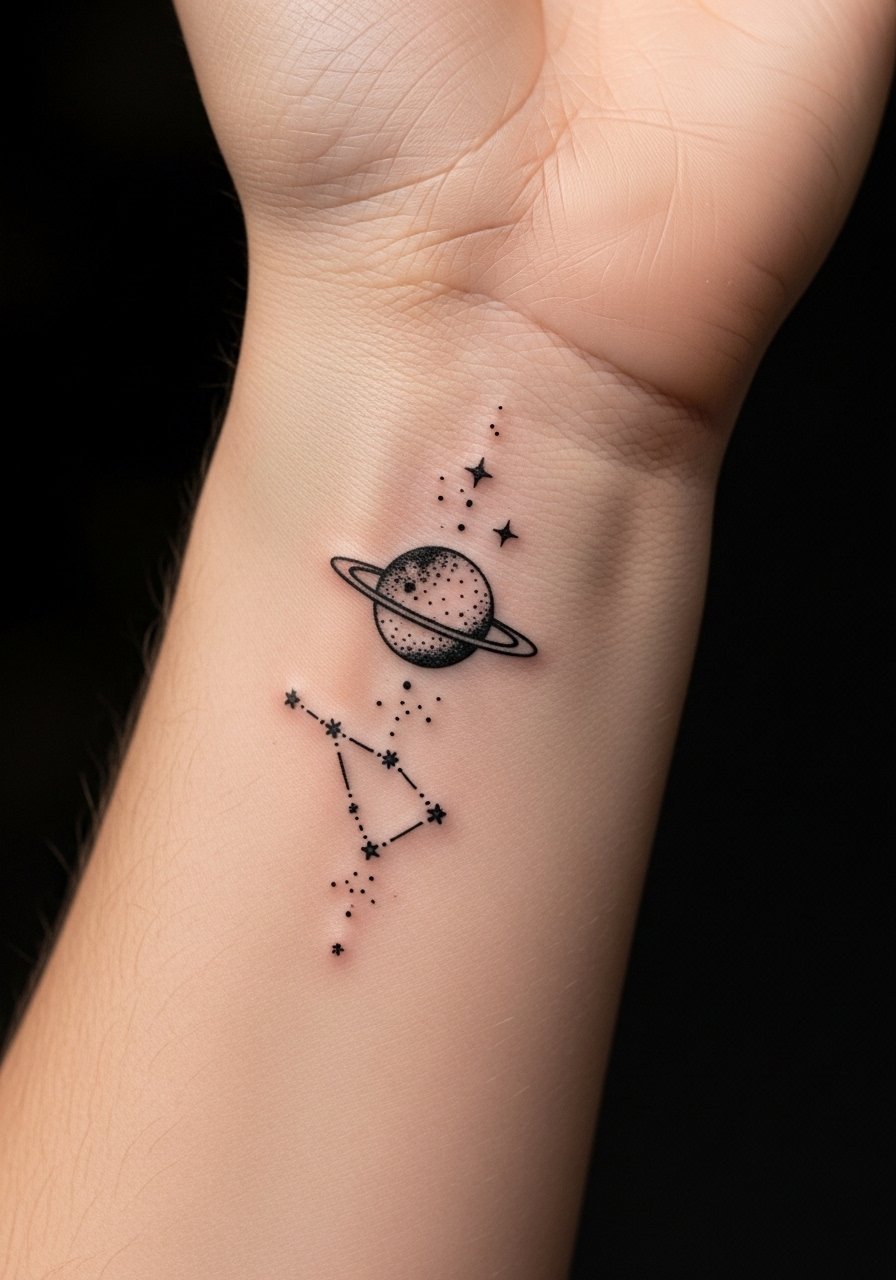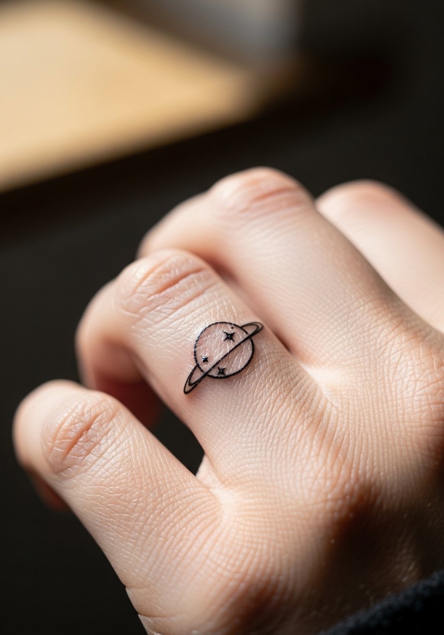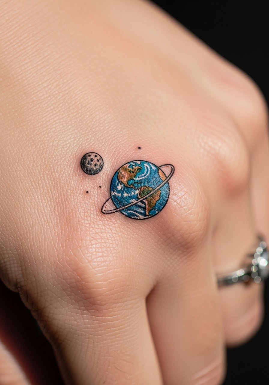 A tiny Saturn on the finger reads like a piece of jewelry and is great if you want subtle planet symbolism. Fingers are low in surface area but high in movement, so fine lines soften over time—expect some blurring. Pain varies; the bony fingers can feel scratchy but sessions are short. For longevity, request slightly bolder lines than a hairline and know touch-ups are common. I’ve seen artists recommend blackwork for finger planets because color fades faster in that spot. Avoid tiny, intricate textures on ringed planets; keep the ring simple and pair it with minimal stars for context. Test placement with temporary transfers or Tatship virtual try-on before committing.
