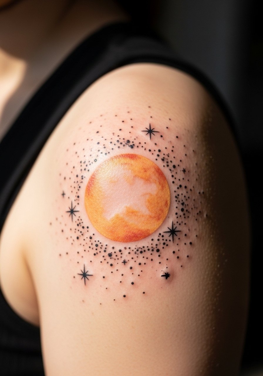 Venus makes a visually poetic tattoo when rendered in watercolor realism—warm tones and soft highlights suggest love and beauty. The shoulder cap is forgiving during healing and ages gently since it avoids constant friction. Watercolor needs more care: colors can look muted when healed unless saturation is planned by your artist. Pain is manageable and sessions are relatively quick. A frequent mistake is overusing white highlights; they can disappear over time, so ask for strategic contrast rather than heavy white ink. From what I’ve gathered, artists who excel at watercolor planets will show healed photos on various skin tones—ask to see those and request a Procreate mock to preview color interactions.