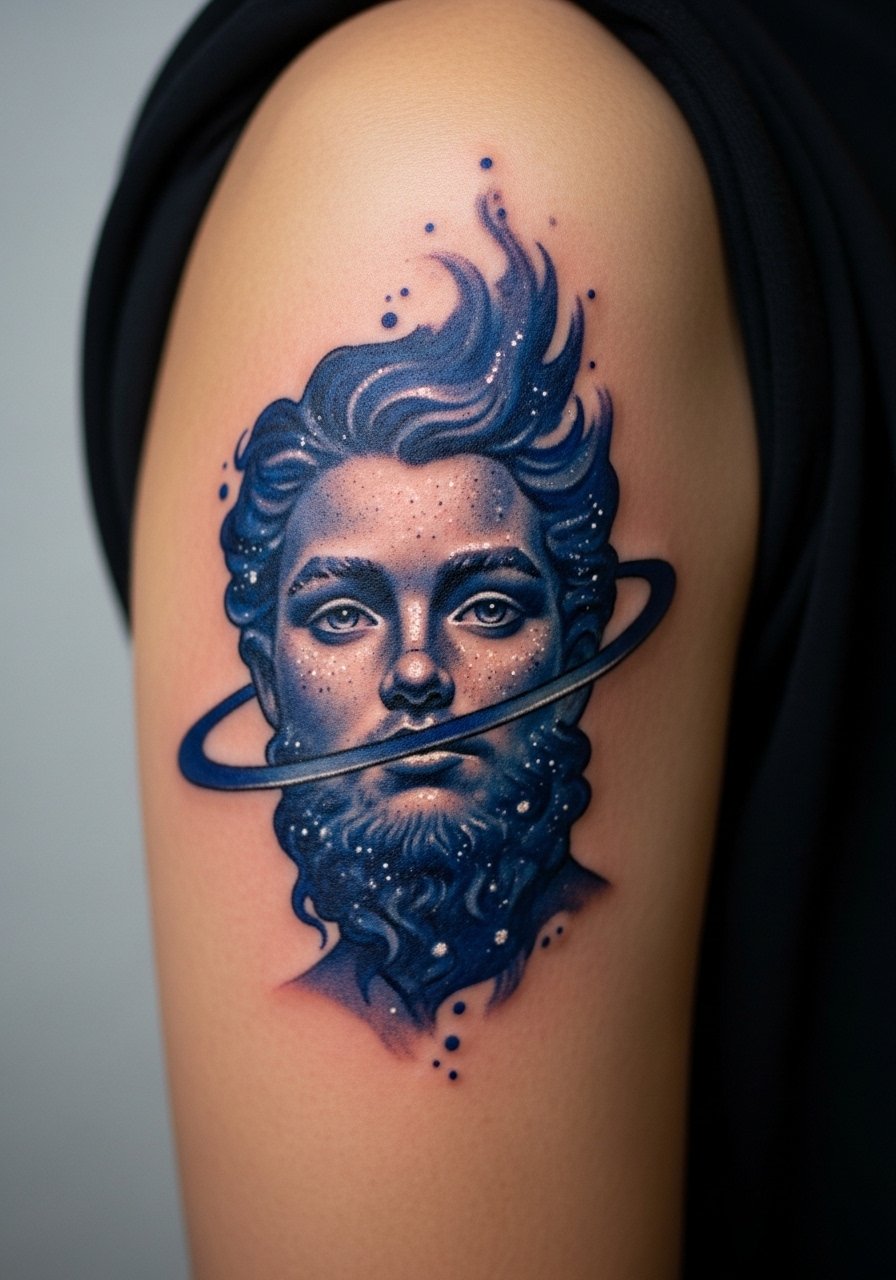 Neptune tattoos read as inward journeys—mists of blue and soft highlights that suggest intuition. The upper arm gives enough canvas for layered atmospheric shading without excessive pain. Healed blues can look muted, so artists will often build contrast with deep outlines or dotwork. Watch out for over-blending; too-smooth transitions can flatten once the skin settles. I like to ask artists for a layered approach: a core realism planet, surrounding illustrative stars, and dotwork accents. If you want this as a talisman for inner voice, pair it with subtle script or a crescent moon. Many tattoo communities I follow recommend planning touch-ups for blues to keep that dreamy quality over time.