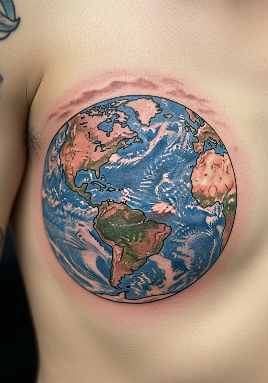 An Earth portrait with landform detail feels personal and activist-minded. Rib placement gives a curved backdrop that flatters globe shapes but is one of the more painful spots. Healing can be trickier due to clothing friction; expect longer surface healing. Color contrast between oceans and land needs strong saturation and careful planning for how pigments settle on your skin tone—artists experienced with diverse clients can advise which hues will remain distinct. A common slip-up is cramming too many small map details into a compact orb; larger rib placements work best. I’ve seen portfolios where artists use fine white highlights sparingly to suggest clouds rather than heavy white ink, which often fades. Bring reference photos and ask for healed examples on similar skin tones.