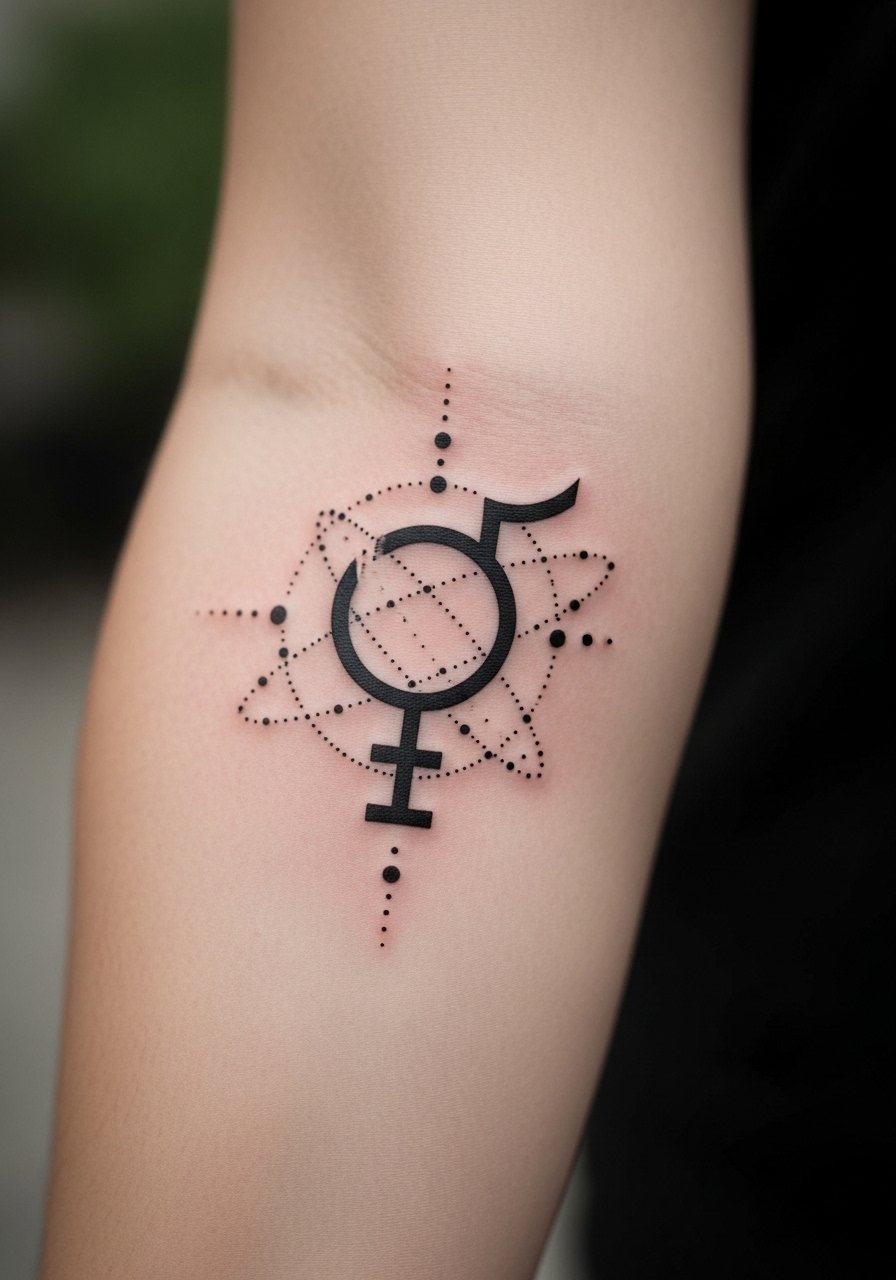 A Mercury-inspired planet or symbol on the inner forearm reads as a daily reminder of quick thinking. The inner forearm is forgiving and a first-timer friendly spot. Geometric linework here should be bold enough to survive natural softening; very thin lines can blur. The design can be compact but still detailed if the artist spaces the elements thoughtfully. Watch for cramped composition—ask your artist to add small gaps or dotwork separation so the design breathes. From chatting with artists, Mercury pieces often pair well with tiny script or constellation lines. Use virtual try-on tools like Tatship to preview how a forearm alignment will look when you bend your arm.
