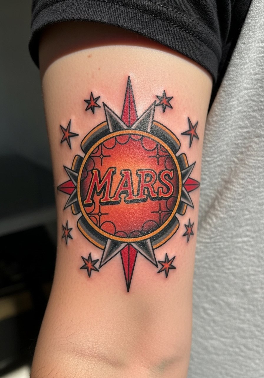 Mars makes a great bold emblem for courage when executed in neo-traditional style—strong outlines and saturated reds read clearly as they age. The outer bicep is low pain and perfect for showing off or hiding under sleeves. Colors like red tend to settle; a skilled artist will plan saturation and contrast so the piece keeps its presence when healed. The mistake I often see is relying on tiny textural details that disappear; prefer bold shapes and layered color fields. Ask to see healed neo-traditional pieces and request a sketch that demonstrates how shading will hold after healing. This placement also adapts well into half-sleeve planetary narratives.