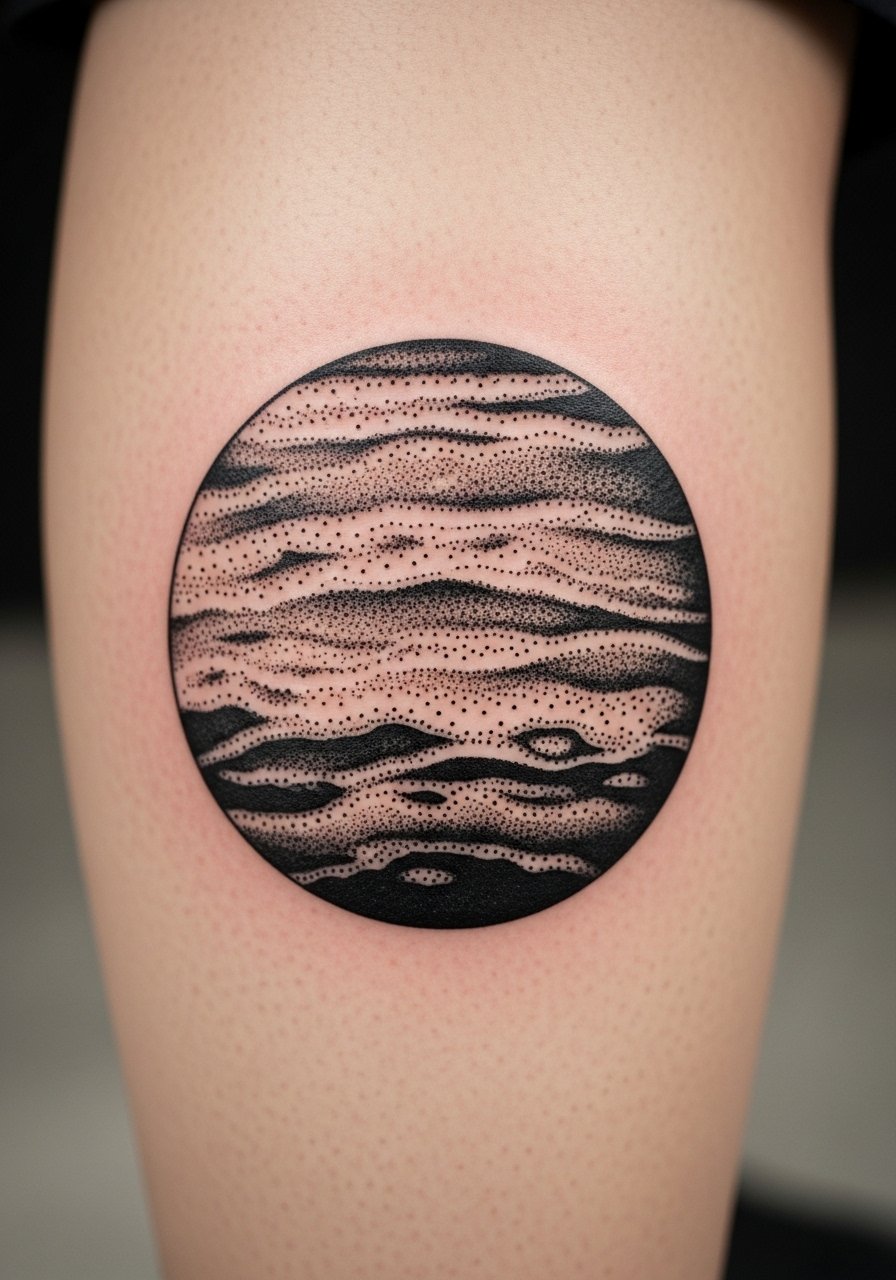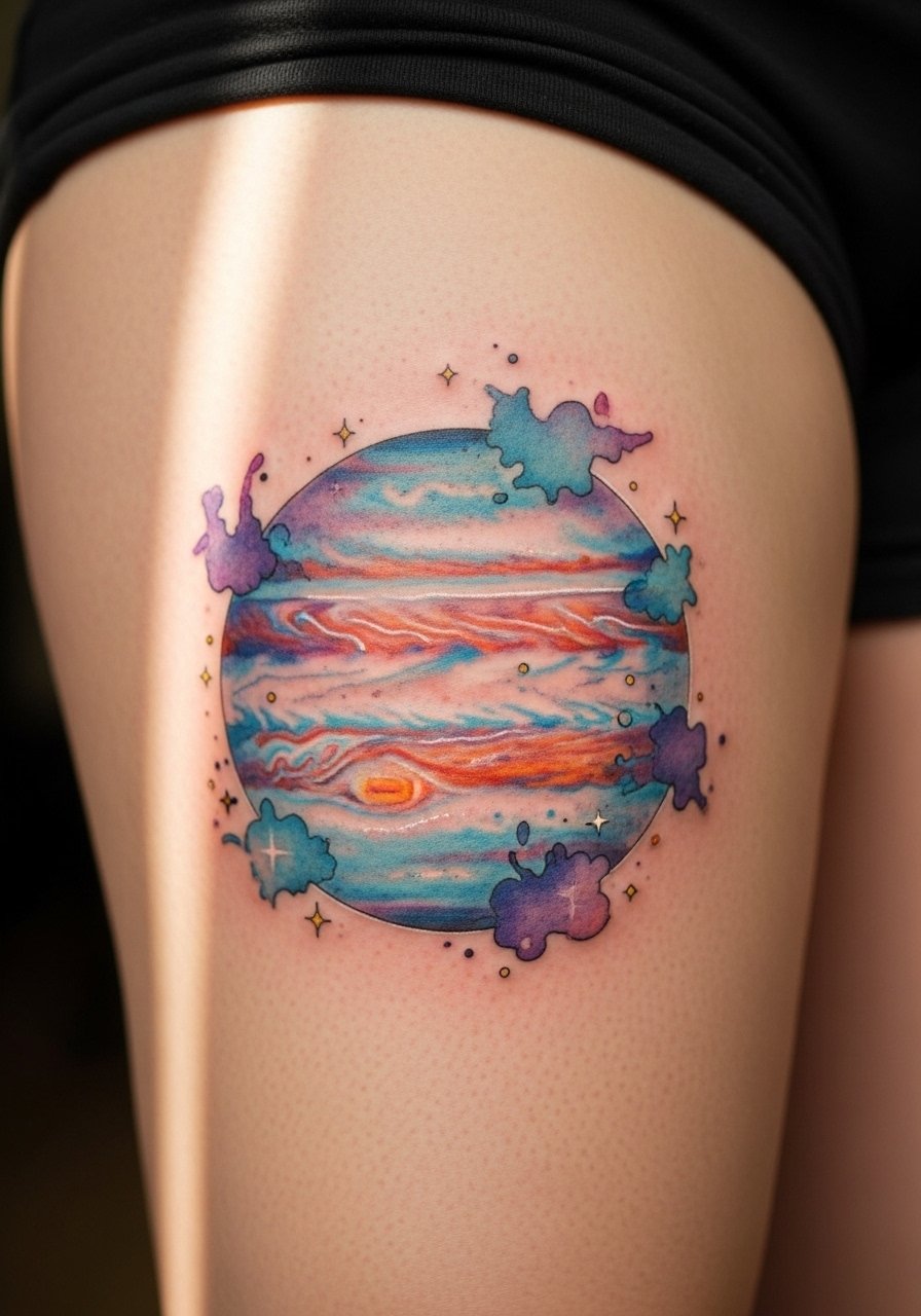 The thigh is ideal for a large watercolor Jupiter—there’s room for sweeping clouds and layered color that reads like motion. Thigh placement sees less sun and abrasion, which helps keep watercolor vibrancy longer. Healing is easier compared to rib or ankle placements but still needs diligent aftercare. Watercolor planets age by softening; ask your artist how they plan saturation and where they’ll use black anchors to prevent total washout. Also consider how the piece will look with clothing; compression can affect healing. I've noticed artists who integrate subtle geometric elements into watercolor pieces create compositions that remain readable as pigment migrates.