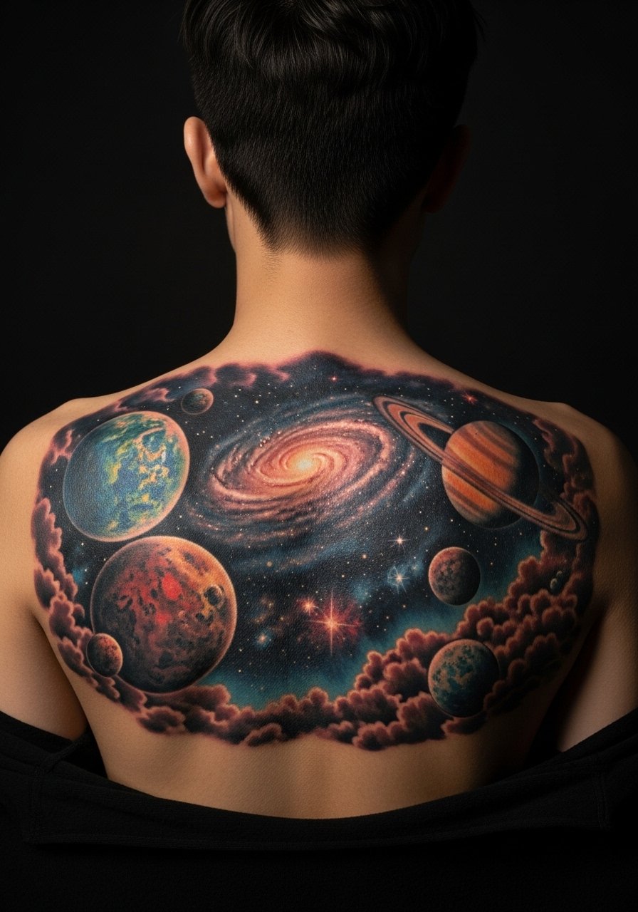 A back galaxy scene gives maximum space for photoreal planets, nebulae, and stars. It’s a commitment but the payoff is a cinematic piece. Expect multiple sessions and a realistic healing timeline. Realism needs careful contrast planning—without black anchors, small details can wash out. One common error is cramming too many tiny elements into a single plane; depth and scale are everything. Ask artists for healed gallery shots of large realism space pieces. From what I’ve seen, these are best handled by artists who specialize in photorealism rather than generalists. Consider how the piece will interact with spine curvature and shoulder movement during design planning.