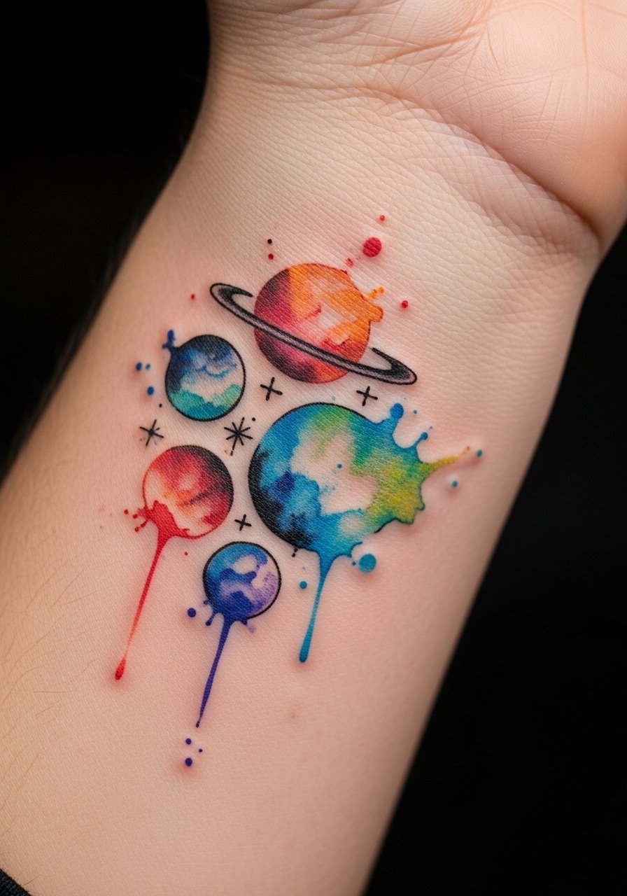Wrist clusters are charming for small watercolor planets, but the wrist is exposed to sun and frequent washing, making color maintenance key. Watercolor here creates a dreamy, artistic vibe, especially when combined with micro-stars. Pain is manageable. The common oversight is expecting the same saturation as on thigh or back—ask for richer initial saturation and plan for touch-ups. Black anchors or tiny outlines can help the planets hold definition. I’ve noticed wrist watercolor looks best with simple composition and a few bold accents rather than many blended layers.