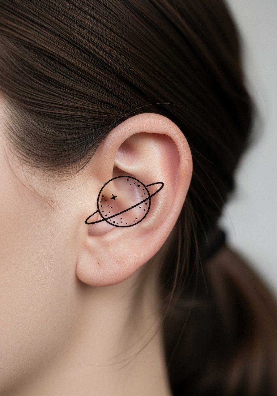 11. Minimalist Planet Outline Behind Ear (Tiny Talisman)