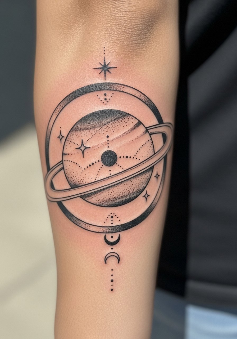 12. Saturn with Celestial Elements on Forearm (Geometric/Ornamental)