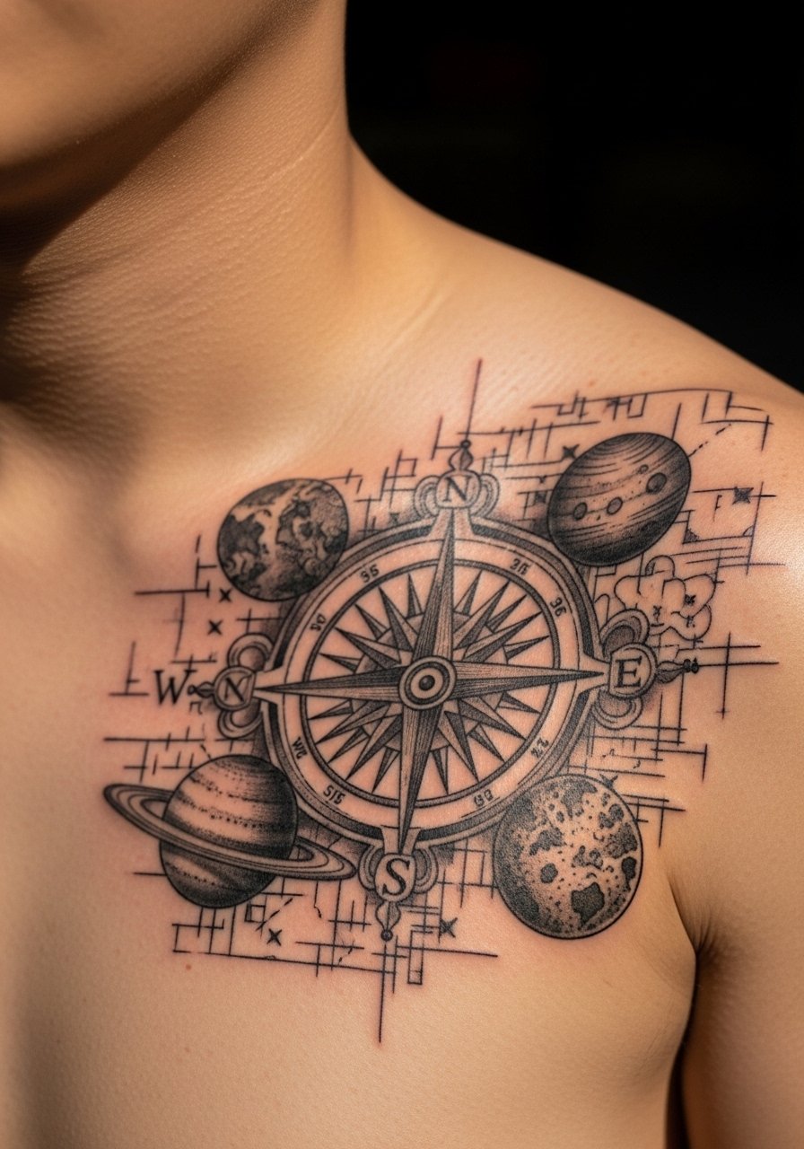 A Renaissance-inspired planet tattoo blends historical engraving aesthetics with modern ink. Upper chest placement allows for symmetrical compositions and reads like a personal emblem. Pain can be moderate near the sternum. Because the style uses fine hatching, ask for slightly stronger line weight so the engraving remains readable as it heals. A frequent error is requesting excessive micro-hatching in small areas—scale up detail to preserve the deliberate aged look. If you love astronomy history, bring reference plates and ask artists to adapt engravings into tattoo-friendly linework.