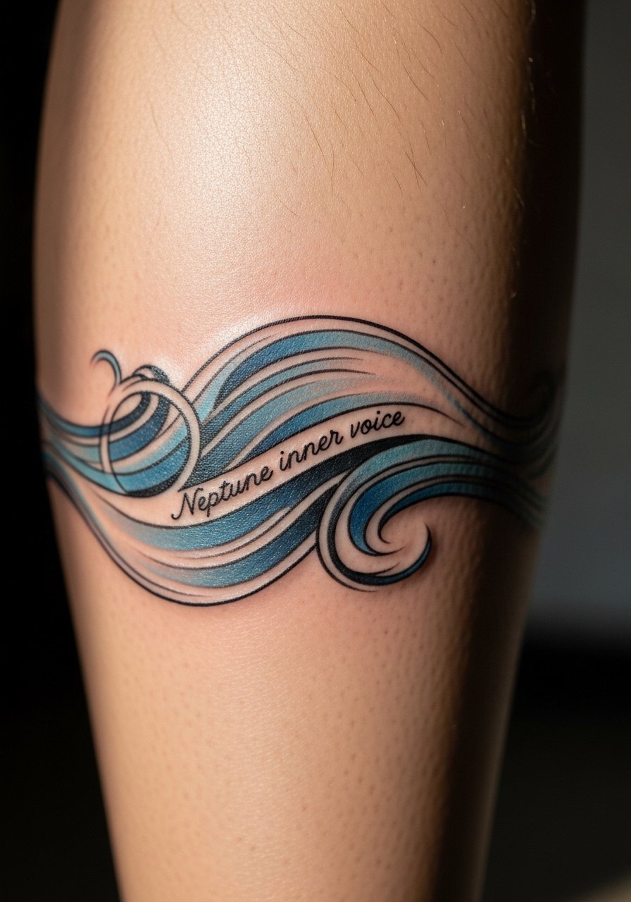 A Neptune band around the calf reads as a quiet symbol of intuition. Calf skin holds shaded blues well if the artist uses strong contrast. Healing is generally smooth but shading needs planned contrast to stay legible. Don’t ask for overly subtle mid-tones without black anchors—those midtones can flatten. I like designs that add a small phrase or dotwork accent to personalize the theme. From what I’ve gathered, calf bands show well in healed photos and are easy to add to later if you want a full leg cosmic sleeve.