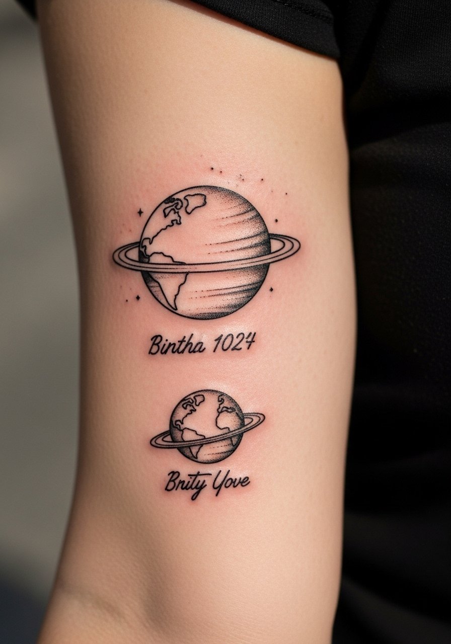 20. Personalized Planet with Birthdate on Inner Bicep (Micro-Realism + Script)