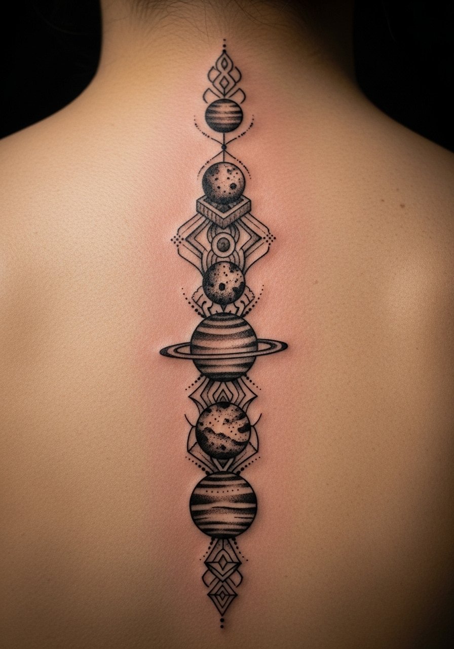 21. Multi-Planet Spine Column (Blackwork + Geometric)