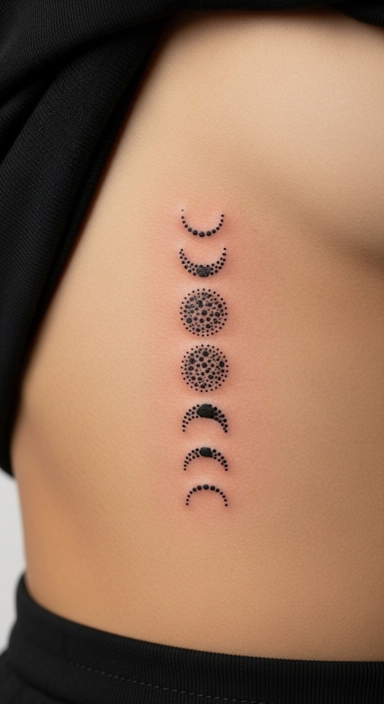 Moon phases stacked vertically make the rib feel like a secret timeline. Micro-shading and dotwork give texture without heavy color. Because these are small, they’re good for testing rib pain tolerance; however, precise dotwork needs a steady artist. Expect surface peeling around days 3–7 and gradual brightening as skin heals.