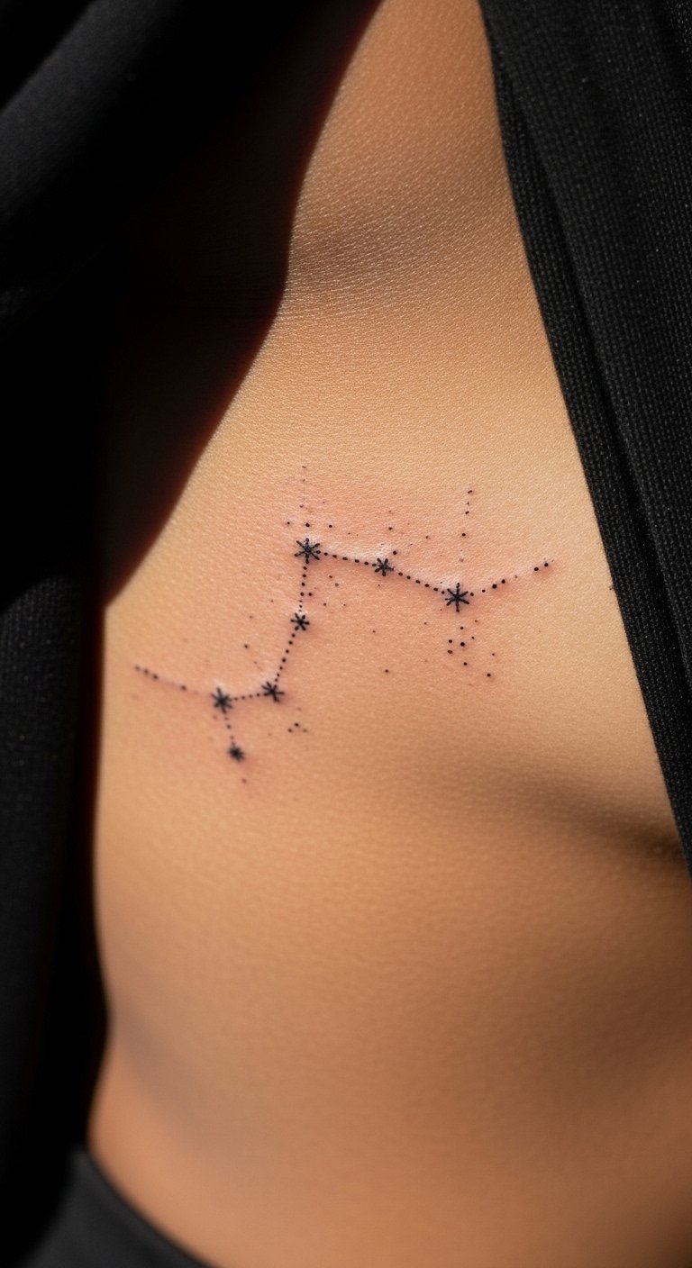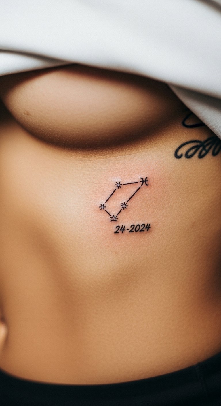 A small crescent with sprinkled stars feels private and elegant. It’s forgiving when placed high on the rib where padding helps; avoid packing too many tiny stars—simplicity wins here. Sunscreen is essential once healed to keep crisp black lines.