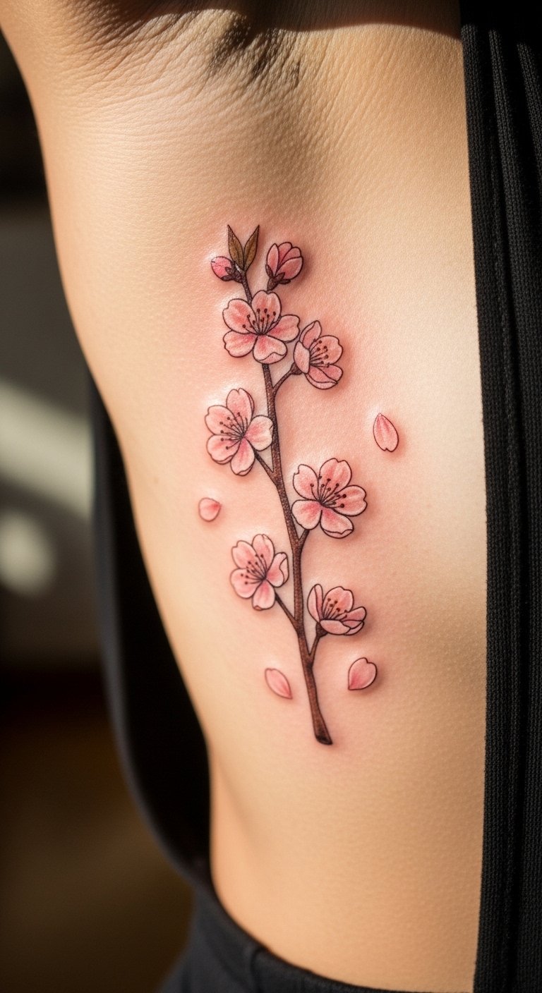 I love cherry blossoms here because the organic shapes move with breathing and curves. Fine line keeps the piece delicate; blossoms and falling petals read intimate when you peek at them in a mirror. Expect sharp sting near the lower ribs and slower healing for shaded buds. Ask your artist for healed photos of similar line weights—too-weak lines can blur over time. Keep moisturized and sun-protected while it settles.
