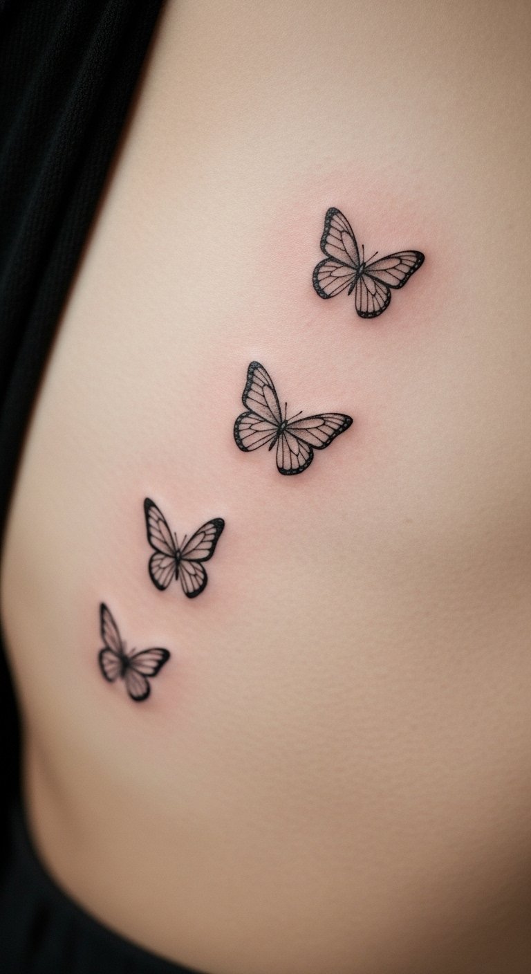 A trailing butterfly sequence reads intimate and motion-based. Keep each butterfly slightly distinct to avoid a single smudge look later; negative space between motifs helps them age better. These are sweet as matching tattoos too.