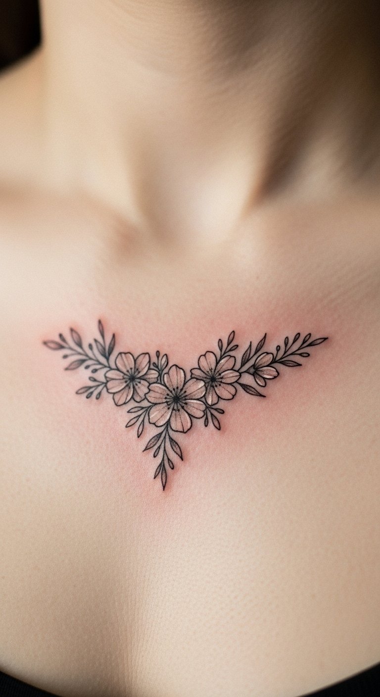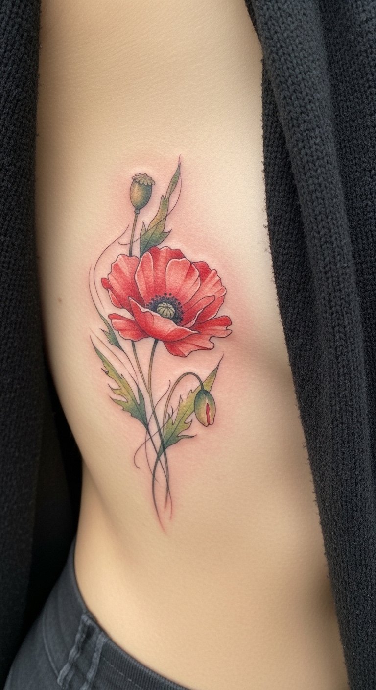 A single sprig with buds stacked vertically complements rib length. I like this because the blooms breathe with the torso—designs that move with the body avoid odd distortion. Expect some soreness on the lower rib; plan an easy day after.