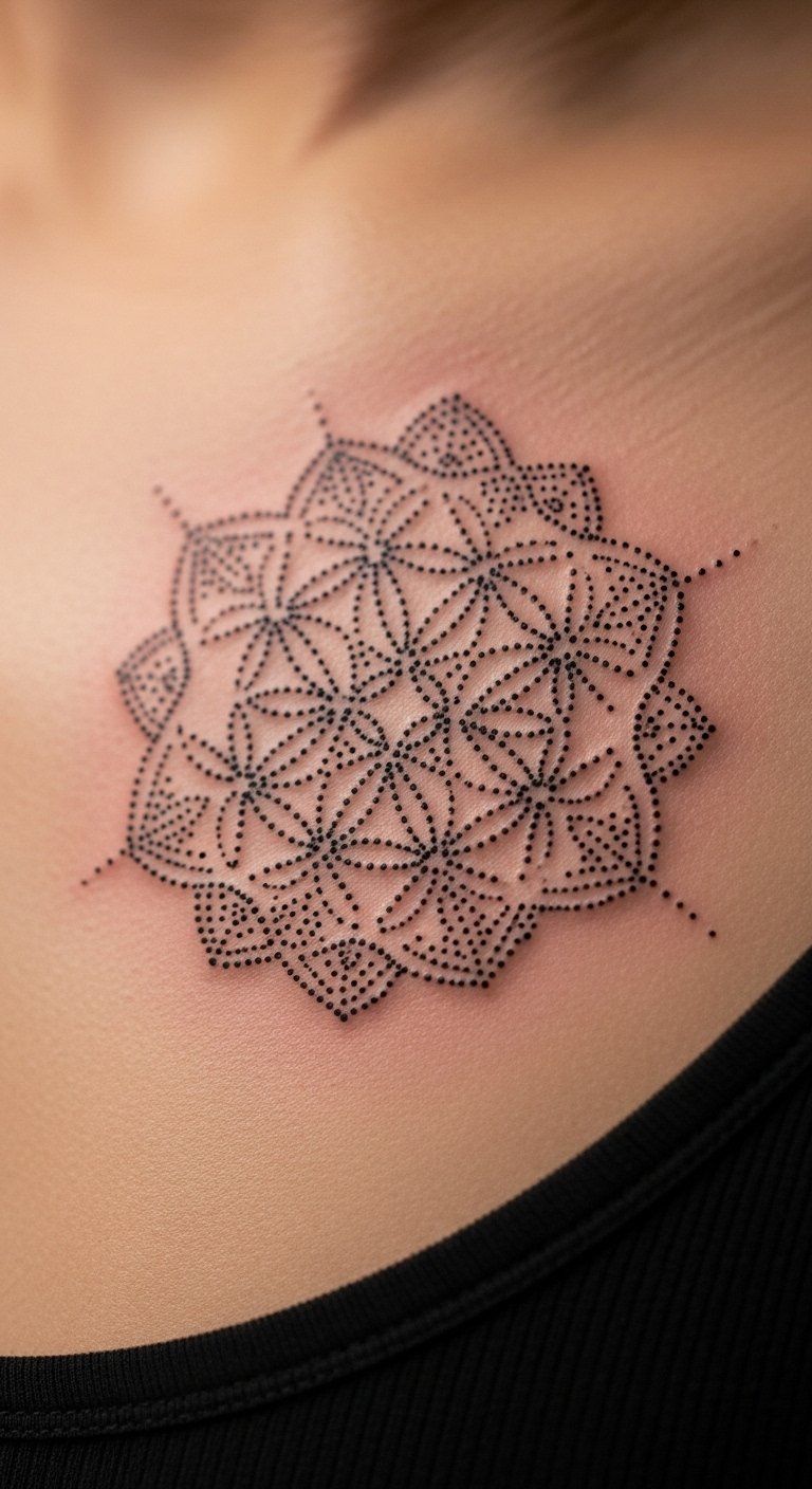 Small mandalas at the sternum/rib junction feel like a hidden charm. Dotwork mandalas age well if the dots are spaced; overly tight dot clusters can merge. Healing tends to itch in this area—resist scratching and use light moisturizing.