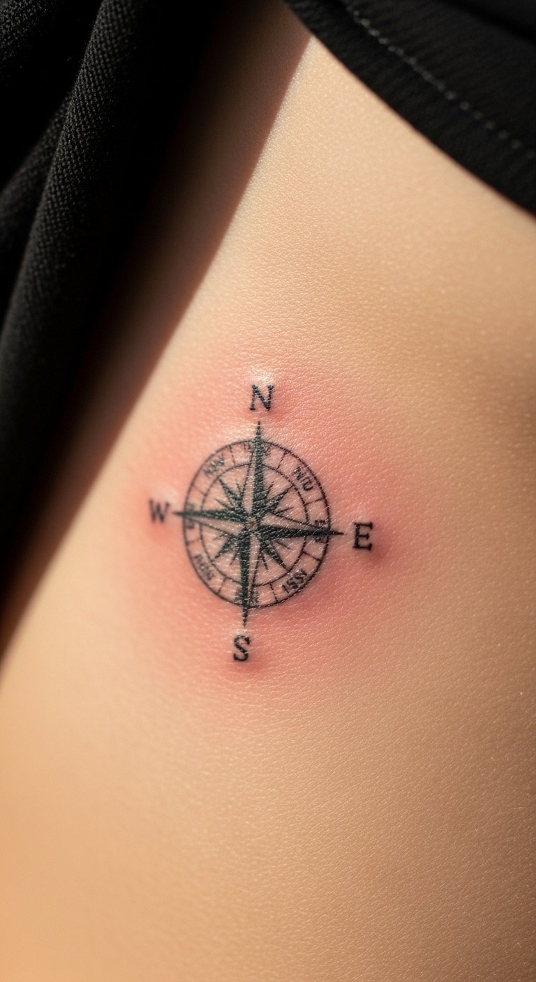 A slim compass or directional arrow reads understated and meaningful. Clean, slightly bold lines hold the test of time better than hairline maps. Placement near ribs gives the piece a private nod to adventure.