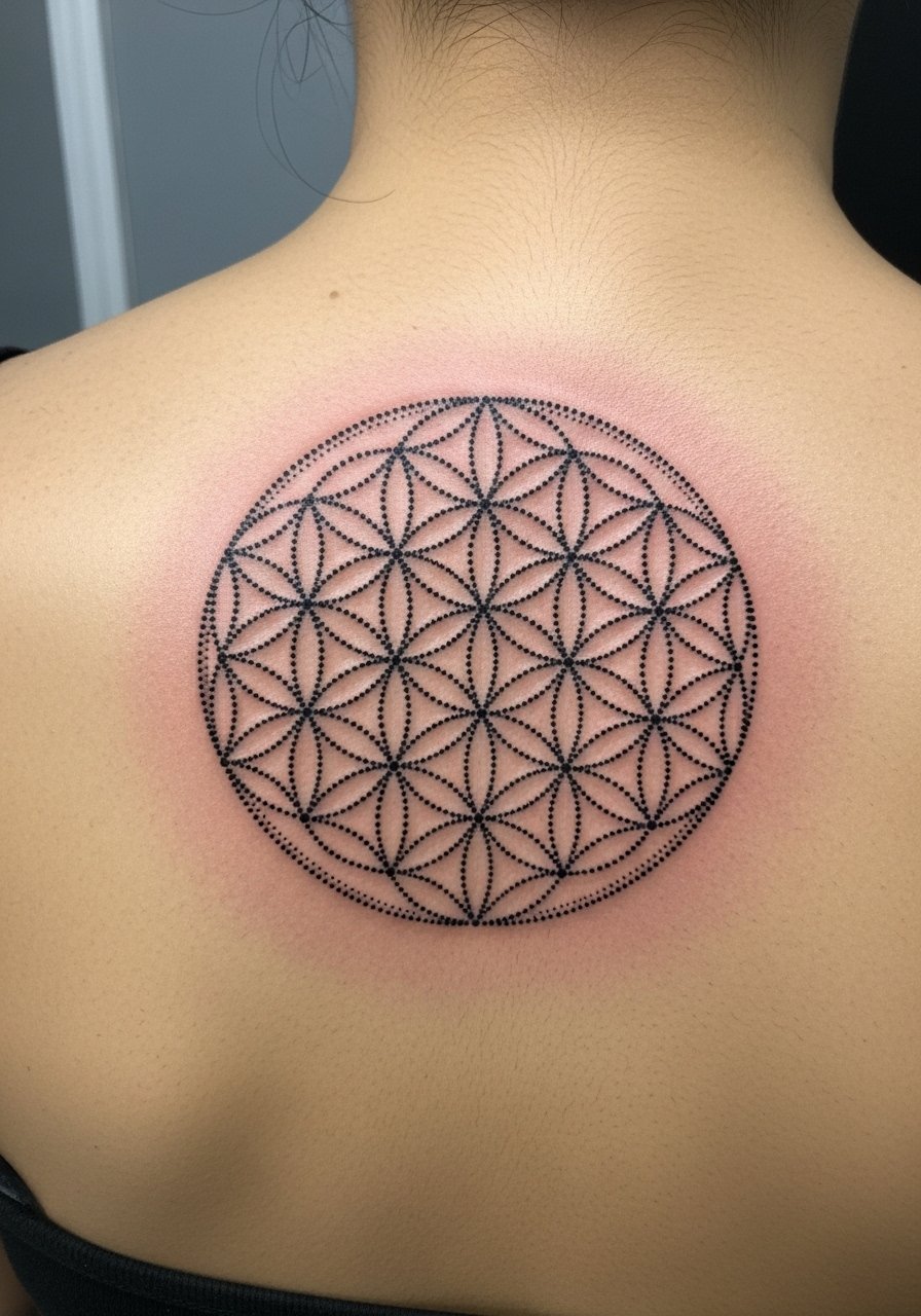 The Flower of Life reads like a classic for a reason—overlapping circles that give a sense of interconnectedness. As a back piece it gets enough canvas to keep the circles precise. Expect mild soreness during sessions but less pain than rib or sternum work. Healing favors dotwork: keep it moisturized and out of direct sun. From what I've seen, crisp black dotwork ages better than colored petals; fine lines can blur if the design is too small. Ask an artist familiar with sacred proportions—I've mentioned Dillon Forte to a few friends and they appreciated his approach to spacing. Avoid cramming too many tiny circles; give each ring room to breathe.