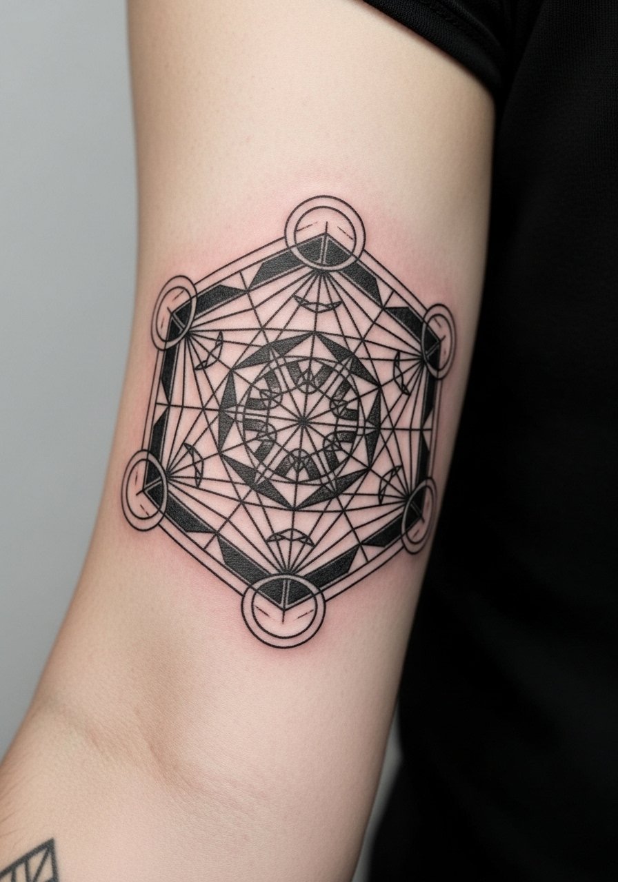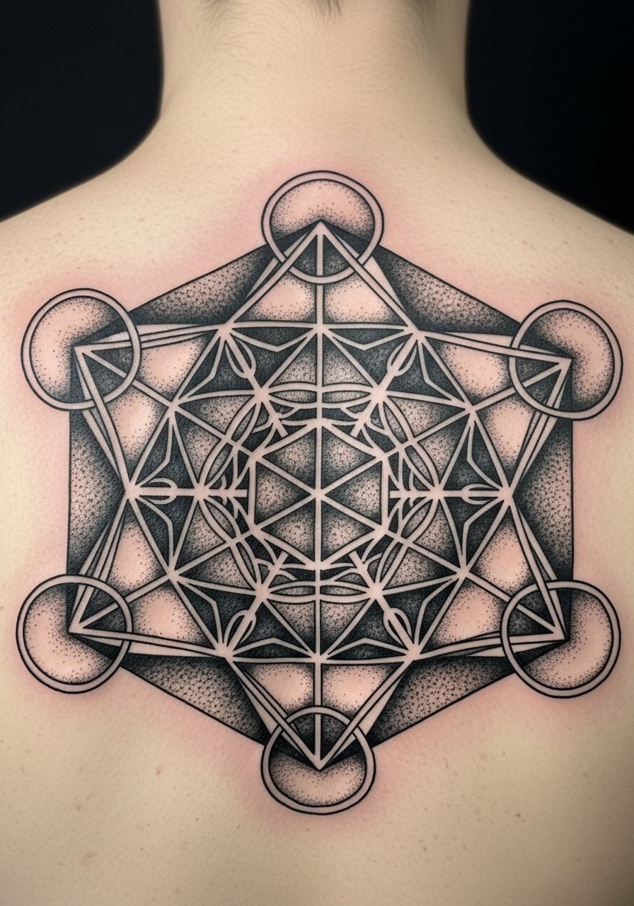 The Cube of Metatron deserves scale. On the upper back you can retain the cube’s 3D illusion without losing line clarity. Sessions may be longer, but the back heals well with proper aftercare. In my experience, dotwork helps transition heavy geometry into soft gradients that age gracefully. Common mistake: trying to compress the cube into too small an area; it becomes a blur. Prioritize an artist experienced in geometric grids to keep symmetry crisp.