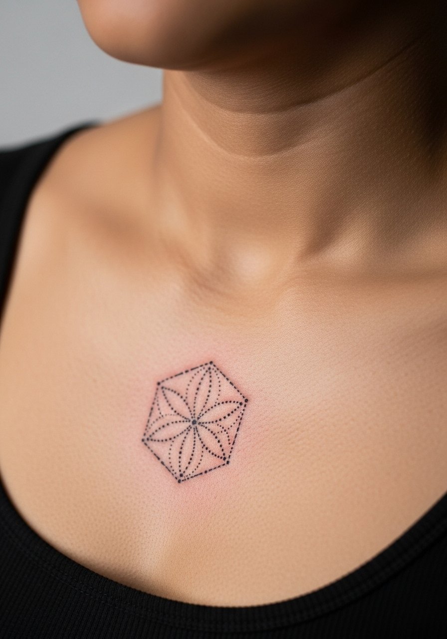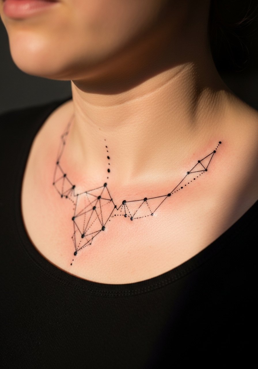 Collarbone geometry reads as delicate and visible with a neckline—great for balance-oriented designs. Pain is higher near bone. In my experience, spacing key points wider prevents lines from merging. Keep dot separators to preserve crispness and plan clothing for the first week to avoid rubbing. Artists usually advise against tiny clusters too close to the bone.