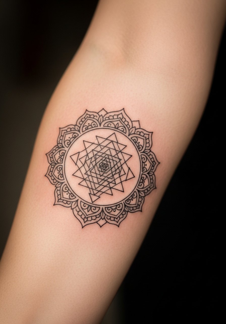 Sri Yantra brings a meditative focus with its nested triangles. On the inner forearm it becomes something you can look at during quiet moments. Pain is manageable and healing tends to be straightforward if you avoid heavy sun. I've noticed people who pick this symbol for a deep personal reason tend to choose blackwork to avoid color-fade regrets. Common mistake: making the geometry too small. Ask your artist about sacred proportions so the triangles line up perfectly and remain readable after healing.