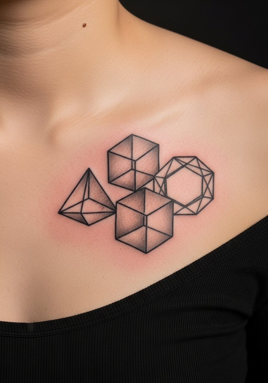 Platonic solids are underrated as tattoo motifs—they each represent an element and can be combined into a compact chest piece that still breathes. The chest gives enough space to maintain clean edges. Expect tenderness across the sternum and near the collarbone. In my experience, grayscale texture adds depth without the aging trouble of bright colors. A frequent error is poor alignment; these shapes need precise angles. Bring printed references and ask your artist about rotational symmetry so the solids look intentional from multiple views.
