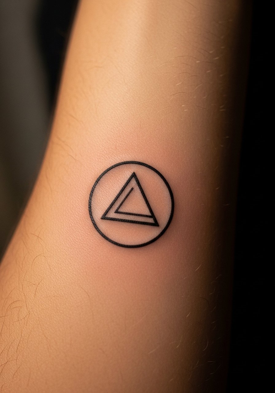 This simple geometry reads like a compact statement about unity or the trinity. Inner forearm placement is forgiving for linework and easy to hide if needed. Pain is mild. I recommend solid, slightly bolder single-line direction—too fine and the edges blur over time. Ask to preview stencil placement; tiny shifts matter for circular symmetry. This is a great "first sacred geometry tattoo" I often suggest to friends who want a meaningful but low-commitment design.