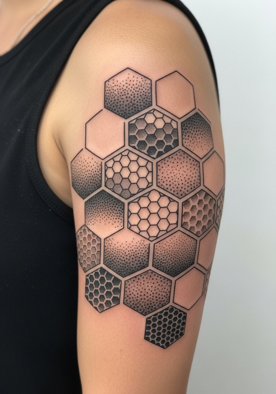 Hexagons let you build a sleeve like tiles—modular and expandable. Negative space between cells creates a fingerprint-like pattern that reads organic and stable. It can be slightly more painful as you approach the elbow. From what I've seen, artists recommend mapping the mosaic to the arm's natural curves to avoid optical warping. A common mistake is making all cells identical; vary lineweight and dot density to create depth. This is one of those pieces that grows well over time into a full sleeve.