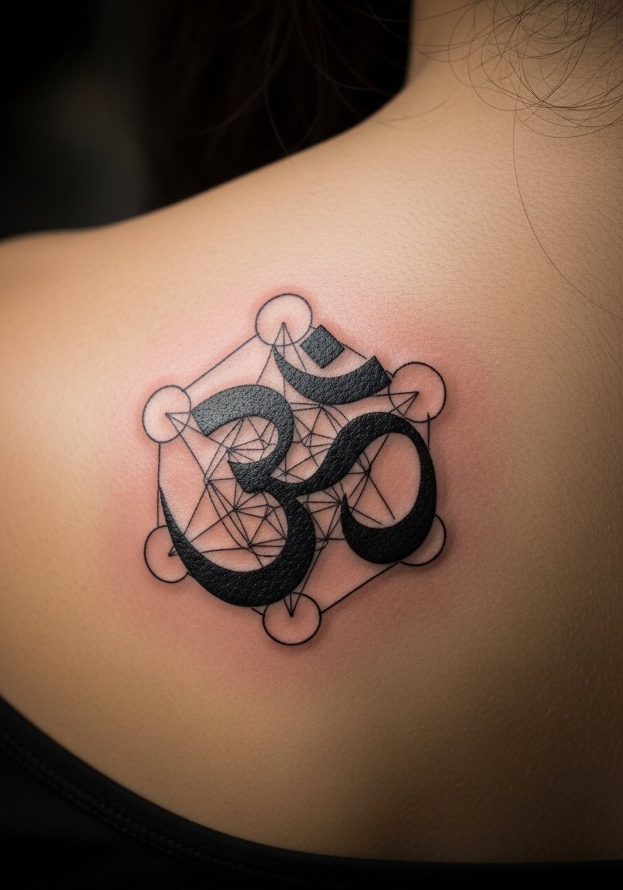 Combining script-like Om with Metatron geometry balances chant-based spirituality with structural pattern. The shoulder blade gives enough flat space for precision and is lower pain than sternum or ribs. I've noticed this overlay looks best when the geometry is slightly lighter than the Om glyph—contrast helps both elements stay readable as they age. Avoid over-detailing the overlay; keep it simplified so the sacred proportions remain intact after healing.