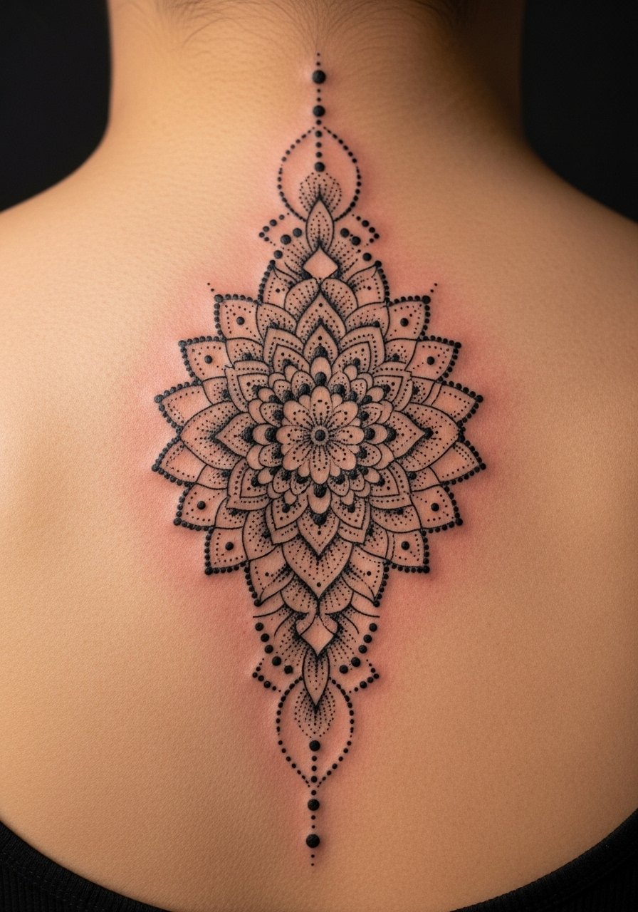 A mandala down the spine reads like a centered meditation. Pain is higher along vertebrae but placement yields striking symmetry. I've seen these age well when the mandala elements are sized to the spine’s length—tiny petals near bone blur. Artists often recommend building the mandala outward from the center so proportions remain balanced. Keep aftercare focused on avoiding friction from clothing while it scabs; that prevents ink migration and preserves precise dotwork.