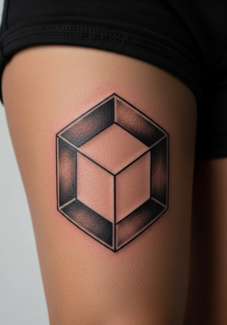 A hollow cube on the thigh uses negative space brilliantly—great for covering older ink or adding depth without heavy shading. Thigh placements are low-pain and forgiving with swelling. I've noticed negative space designs can hide minor line shifts as they heal. Common mistake: over-detailing the internal faces; keep geometry bold so the cube reads from a distance and up close. This design adapts well for diverse skin tones, especially with solid black edges.