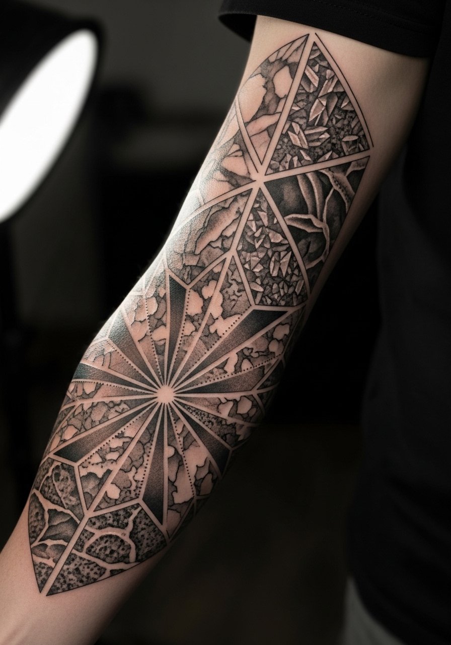 Grayscale granite brings a tactile, almost geological feel to sacred geometry. It reads like cosmic stone wrapping the arm. This is a commitment that ages beautifully if shading is done by an artist skilled in grayscale transitions. Expect tougher sessions and longer healing windows. I've seen these hold up because the texture creates forgiving edges—small blurring becomes atmospheric rather than messy. Avoid over-contrasting tiny details; larger strokes and subtle gradients fare better long-term.