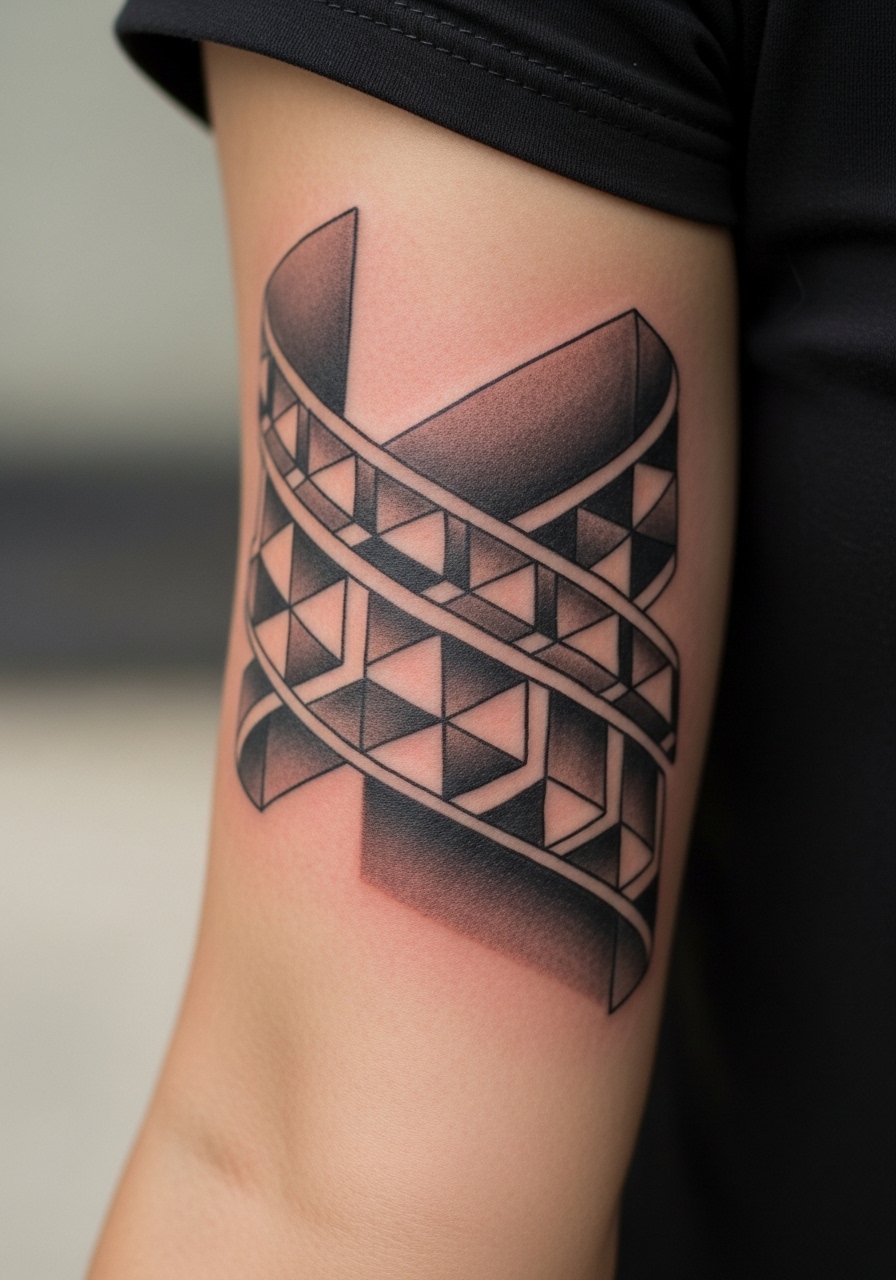 This under-covered idea—3D geometry wrapping the arm—creates movement and shifts as you flex. It’s visually striking and practical: the bicep provides a rounded surface that enhances the 3D illusion. I've seen artists use negative space and varied lineweight to sell depth. Avoid forcing a flat pattern around curves; have your artist mock up the stencil in motion. For aging, slightly bolder lines help the 3D effect persist.