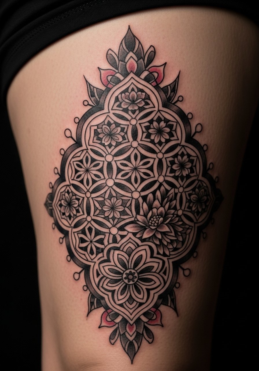 17. Sacred Geometry Thigh Mosaic with Floral Accents