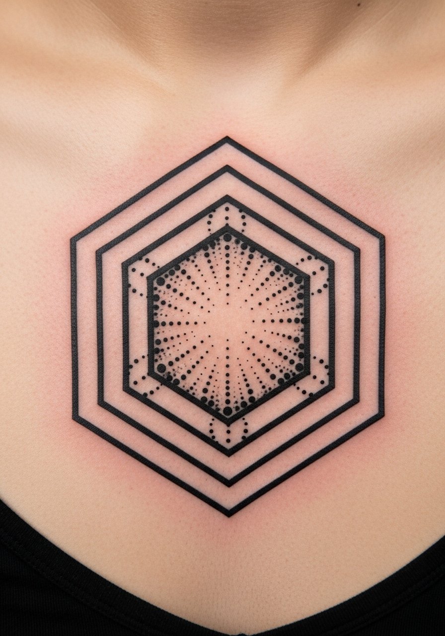 Sternum geometry is dramatic and symbolic but comes with higher pain. Nested hexagons create a ripple effect out from the center chest and feel grounding. From what I've seen, scaling and symmetry are critical—tiny misalignments show quickly. Keep interior details moderate; heavy interior shading on the sternum can age unevenly. Expect longer healing and careful clothing choices to prevent scabbing disruption.